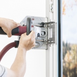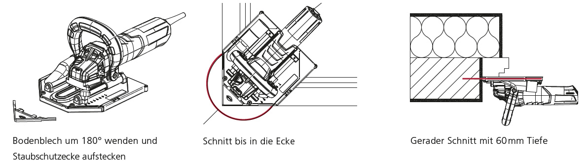 Mit der leistungsfähigen Diamant-Trennscheibe sind Schnitte ins umliegende Mauerwerk, in Fliesen oder die Fensterbank möglich. Das um 180° drehbare Bodenblech ermöglicht zudem auch den Schnitt in die Ecke um das Fenster komplett freizuschneiden. Auch sich im Mauerwerk befindende Befestigungskrallen aus Metall können durchtrennt werden. Mit der optionalen Höhenverstellung kann die Schnittposition für neu einzubauende, dickere Fenster genau eingestellt werden.