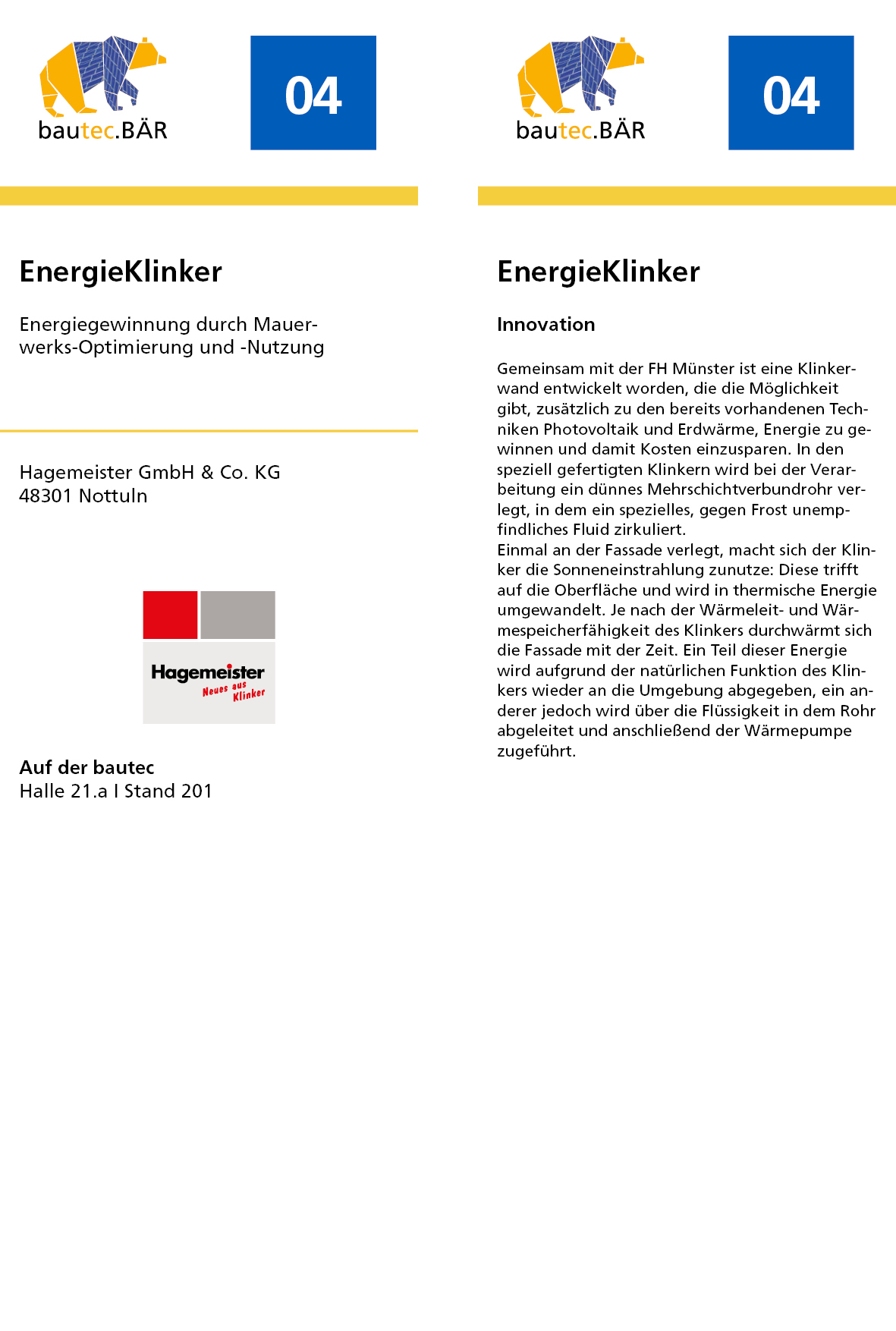 Zum ersten Mal wurde der Wettbewerb „bautec.INNOVATION AWARD“ zur bautec 2018 von der Messe Berlin GmbH ausgelobt. Im Fokus des Wettbewerbes stehen innovative Produkte und Systemlösungen aus dem Bereich des Bauens. Die Preisträger erhielten eine echten Berliner. Einer mit Ecken und Kanten, eben liebenswert. Esther Piehl, Projektleiterin der bautec und Ulrich Zink, Vorstand vom BAKA überreichten 3 Preise und zwei Anerkennungen. Herzlichen Glückwunsch!